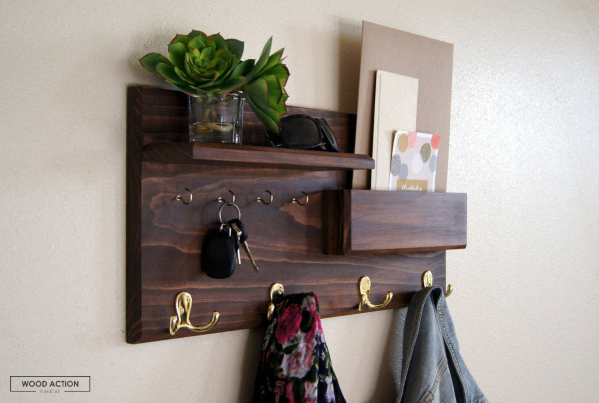 Hand Selected Solid Wood (see photos for finish options)► 24" x 11 1/4" x 3/4" / Shelf: 11 3/4" x 3 1/2" x 3/4" / Pocket: 11 3/4" x 3 1/2"► Keyhole hangers installed for quick and easy mounting (heavy duty anchors and screws provided)